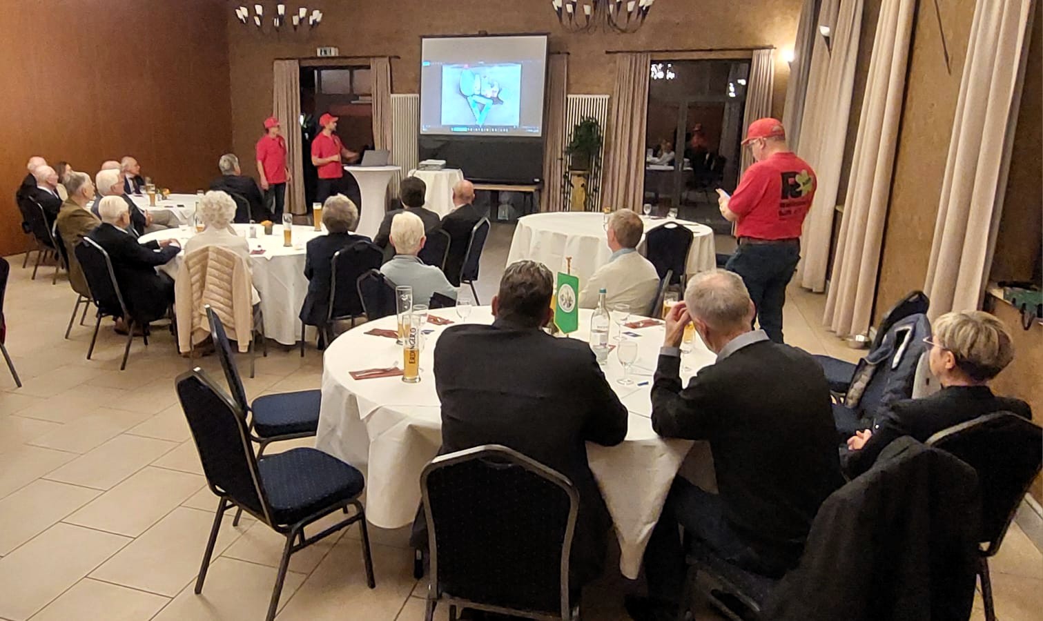 Nach dem hochkarätigen Konzert lud der Club die beiden Vorsitzenden Alfred Eich und Andreas Klassen und deren ukrainischem Partner Jakub zu einem Vortragsabend. In einem informativen, stellenweise emotionalen Gespräch berichteten die Gäste über ihre ehrenamtliche Arbeit in Rheinbach und in der ostukrainischen Stadt Charkiv. So lagern zurzeit etwa 50t Hilfsgüter in der ehemaligen Pallotti-Kirche und warten auf den Transport in das Kriegsgebiet. Schnell verständlich wurde, dass es ausreichend Sachspenden gibt, jedoch finanzielle Zuwendungen dringend benötigt werden. Mit den Geldern bezahlt der Verein die jeweils ca. 4500 € teuren Transporte nach Charkiv und andere östliche Landesteile, kauft Lebensmittel oder lässt kleinere Öfen vor Ort produzieren. Diese werden Bürgern übergeben, die in den „verlassenen Dörfern“ ohne Elektrizität und fließendes Wasser leben müssen. In den kommenden Wintermonaten spenden diese Öfen Wärme und stellen eine warme Mahlzeit sicher.