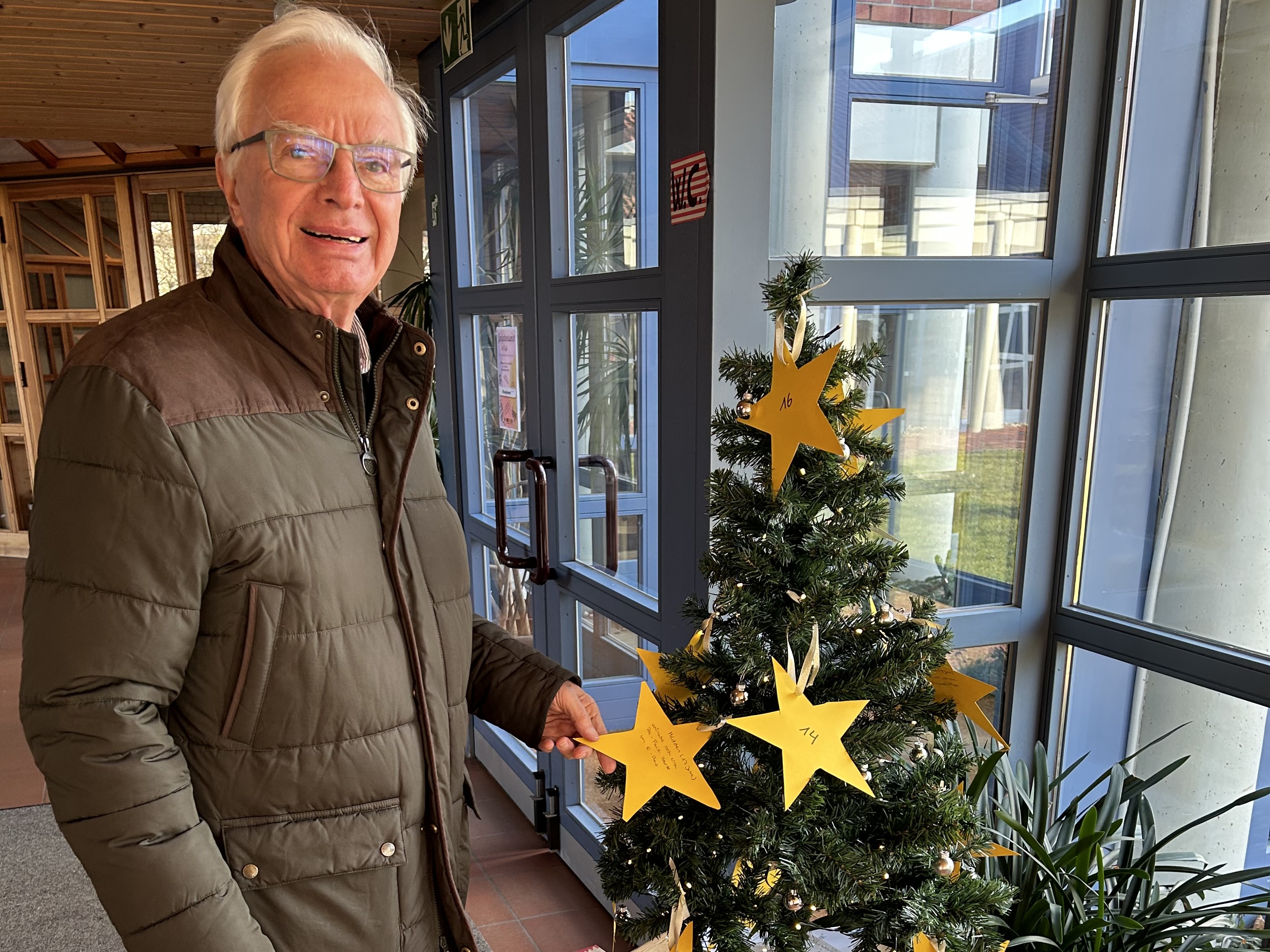 Die Sterne wurden anschließend an den Baum gehängt - dort konnten Besucherinnen und Besucher des Gemeindehauses oder der Kirche einen Wunsch auswählen und erfüllen. Und viele machten Gebrauch und erfüllten einen Wunsch, auch der Lions-Club Bonn-Rhenobacum